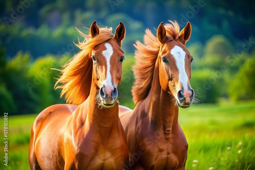 Two Smiling Chestnut Stallions with White Blazes in Meadow - Stock Photo