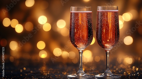 Two sparkling glasses of rose champagne against a blurred golden bokeh background