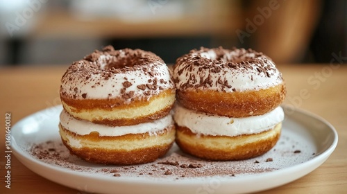 Two stacked donuts topped with whipped cream and cocoa powder on a plate