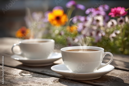 Two steaming cups of coffee on a wooden table, surrounded by colorful flowers in the background, creating a cozy and relaxing atmosphere in the garden.
