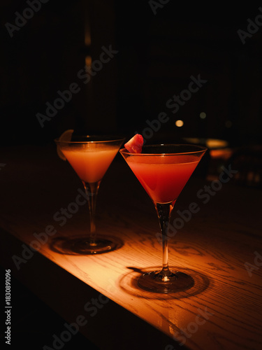 Two stylish cocktails in martini glasses sit on a softly illuminated bar surface, creating a warm, intimate nighttime atmosphere perfect for relaxing or celebrating.