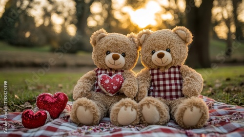 Two Teddy Bears Sitting Together Outdoors at Sunset