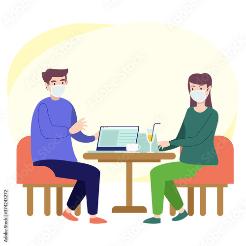 Two teenagers are at a coffee shop discussing work but are still wearing masks