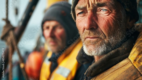 Two weathered men one with a blue cap and the other with a yellow vest stand on a boat looking into the distance with serious expressions.
