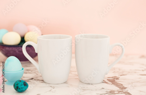 Two White Mugs Mockup - Easter theme. Easter eggs. Colorful eggs in matte colors. Light marble background