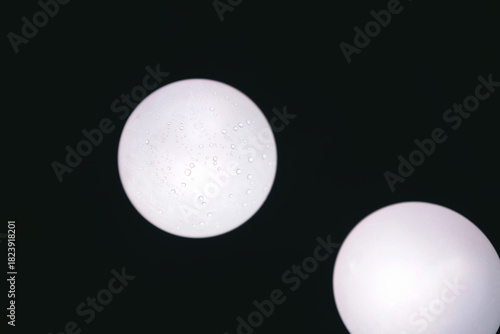 Two white spheres with water droplets against a dark background