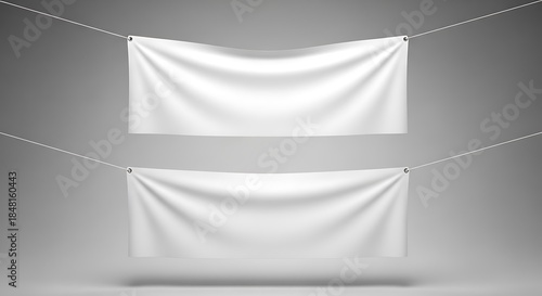 Two white textile banners mockup hanging on rope isolated on white background, realistic blank fabric cloth posters with folds, empty advertising canvas flags template