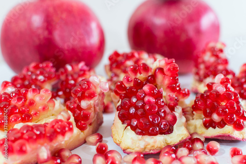 two whole and part of a pomegranate fruit with pomegranate seeds on white background