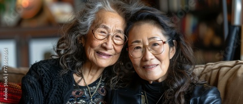 Two women are sitting on a couch together smiling. Generative AI.