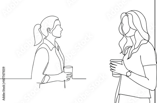 Two women talking over coffee line drawing