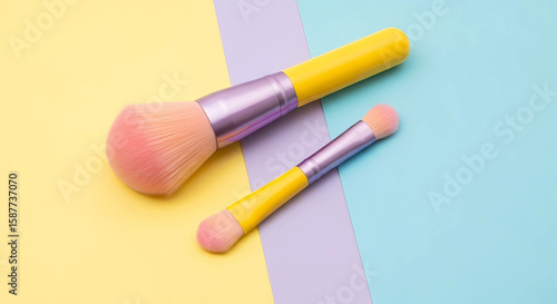 Two yellow makeup brushes with pink bristles on a pastel color block background
