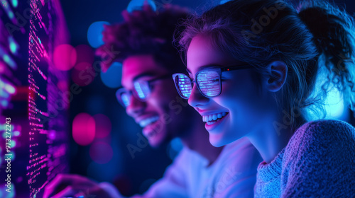 Two young coders happily work late, illuminated by the magenta and blue glow of their computer screen