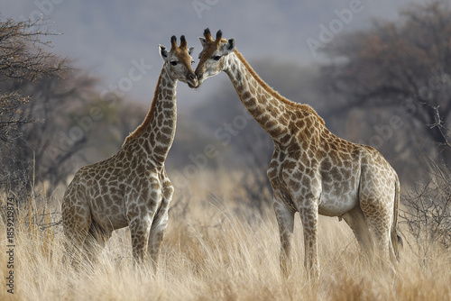 Two young giraffes gently touching heads in dry savanna grassland with blurred trees in background, showing tender moment in their natural habitat
