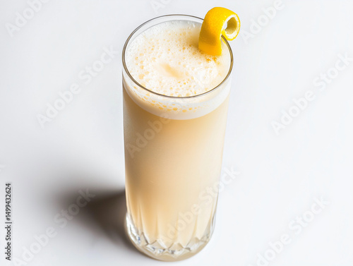 Um gin fizz em um copo alto com uma rodela de limão sobre um fundo branco