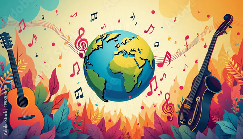 Uma ilustração vibrante celebra o Dia Internacional da Música, com instrumentos musicais e notas ao redor de um globo terrestre colorido.