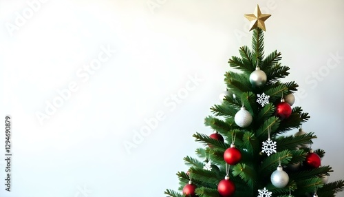 Un árbol de Navidad con una estrella dorada encima, decorado con adornos rojos y plateados y copos de nieve blancos, sobre un fondo blanco