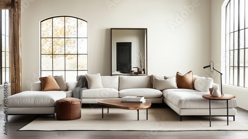 Un elegante soggiorno minimalista, inondato di luce naturale, con un design raffinato e neutro, crea un ambiente accogliente e sofisticato.