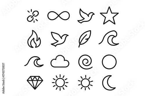 Unbound Icon Collection. Unbound. Line outline icon set of Unbound: broken chain, infinity loop, star, flame,