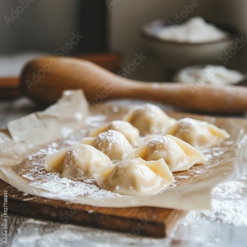 Uncooked dumplings arranged on a parchment-lined wooden board