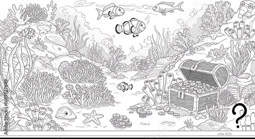 Underwater Coloring Page with Coral Reef and Treasure Chest