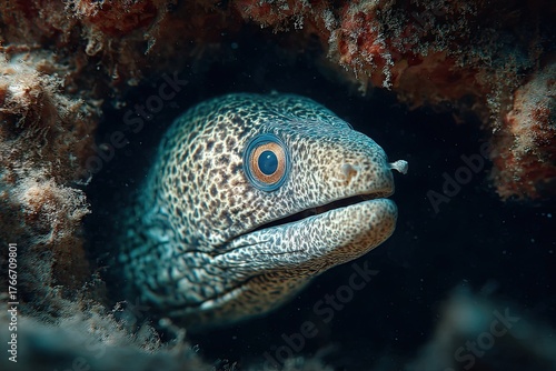 Underwater Moray. Predatory fish underwater. Moray eel in the underwater world.
