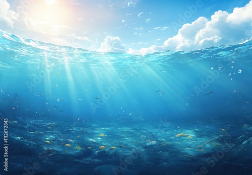 Underwater Scene with Sunlight Streaming Through the Ocean Surface, Vibrant Marine Life, and Colorful Coral Reef in a Serene Aquatic Environment