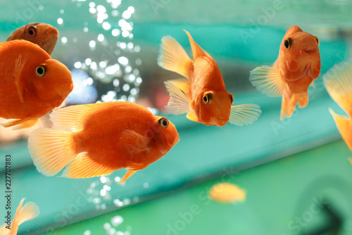 Underwater scene with the company from goldfishes in a house aquarium and vials of air on a background. The place for the text or an inscription