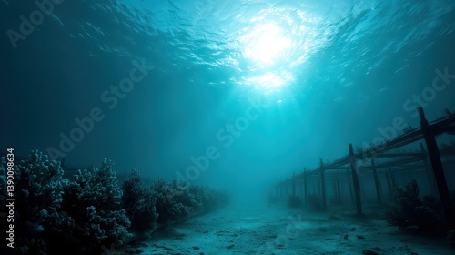 Underwater structures demonstrate innovative regenerative ocean farming techniques aimed at promoting sustainable aquaculture. Sunlight filters through, enhancing underwater ecosystems