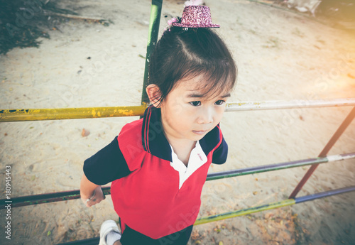 Unhappy asian girl looking aside while feeling sad at children playground.