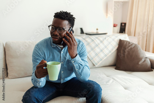 Unhappy handsome young businessman sitting alone in his home office and talking on his cellphone. African young man in eyeglasses sitting on couch, drinking coffe while using his cellphone at home.