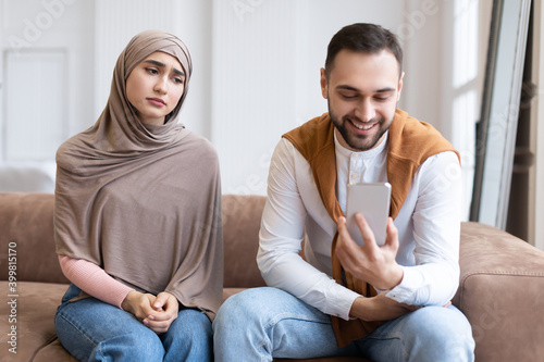Unhappy Muslim Wife Looking At Husband While He Texting Indoor