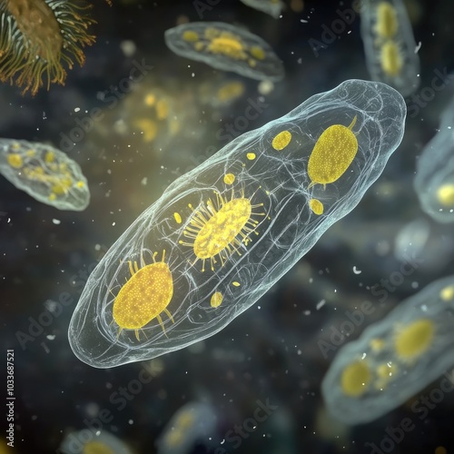 Unicellular organism: protozoan gliding across a droplet, reflecting the simplicity and complexity of primitive life, essential to ecosystems, evolution, and the foundation of microbiological study.