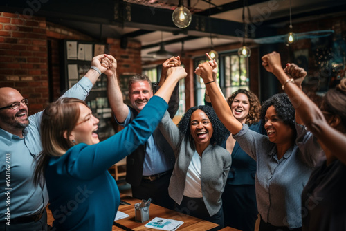 Unified Strength: Diverse Group of Coworkers Raising Hands in a Vibrant Team-Building Exercise