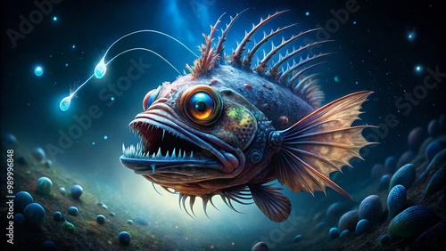Unique and Mysterious Angler Fish in Deep Ocean Waters with Bioluminescent Lure and Distinct Features