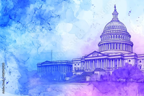 United States Capitol Building illustration, watercolor stain background