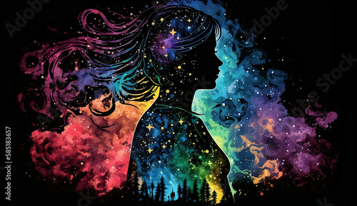 universe meta human goddess spirit silhouette on galaxy space background, new quality colorful spiritual stock image illustration wallpaper design, Generative AI