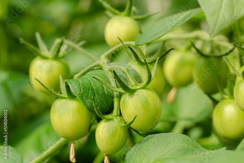 Unripe plum Green heirloom tomatoes ripening on vine bush growing in greenhouse. Organic Gardening farm, copy space.Horticulture, Vegetable harvest. eco friendly farming in countryside village.