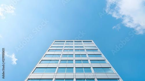 Upward Perspective Of Modern Skyscraper With Glass Facade Against Blue Sky And Cloud Cover