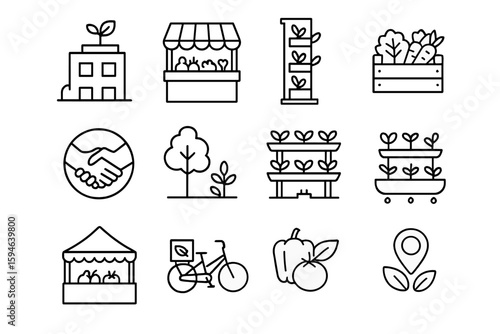 Urban agriculture icons: market, tree, bicycle, fresh vegetables, sustainability