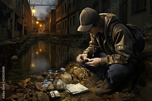Urban Geocaching, urban adventurers hunting for hidden geocaches in city settings