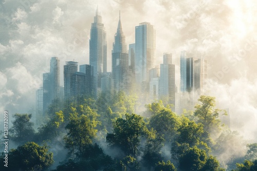 Urban Jungle with Skyscrapers Surrounded by Lush Greenery and Dense Fog in Dreamy Atmosphere