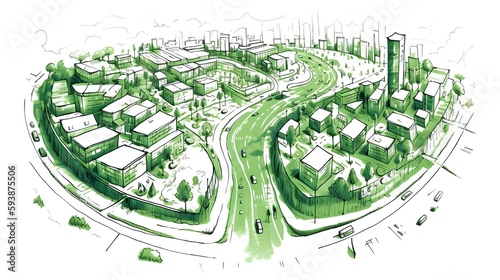 Urban planning sketch highlighting sustainable elements like green spaces, public transportation, and pedestrian zones - Generative AI