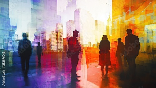 Urban Professionals Navigate Cityscape's Vibrant Energy, Silhouetted Against Sunset's Glow, Contemplating Future Opportunities.