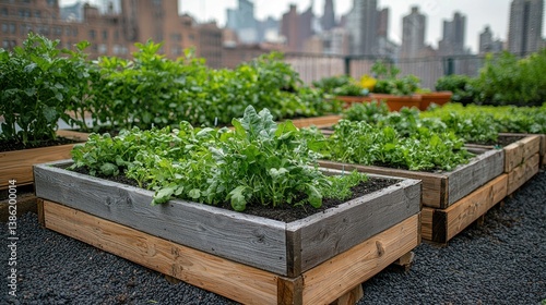 Urban rooftop garden with various herbs and greens growing in raised wooden planter boxes.