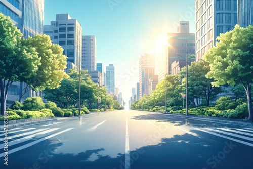 Urban Scenery Modern Buildings Along a Wide Road on a Sunny Day, Anime Style