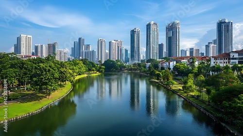 Urban serenity reflections, shimmering cityscape viewed across calm waterway