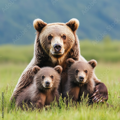 Ursus Arctos: Protective Mother and Her Cubs, brown bear in the grass
