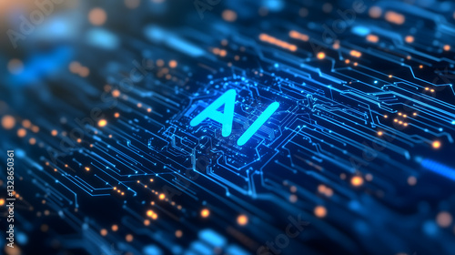 Use the word AI, make a background, high tech, quantum flow, rhombic rays, neural source, left view, blue tint