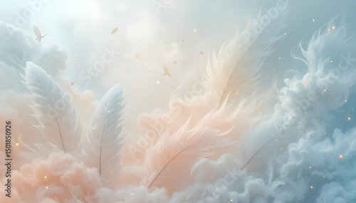 Use watercolour colours and soft, delicate feathers to create a dreamy, artistic gradient that captures the lightness and tenderness of the sky blue, milky white, and pale peach tones. Add subtle text