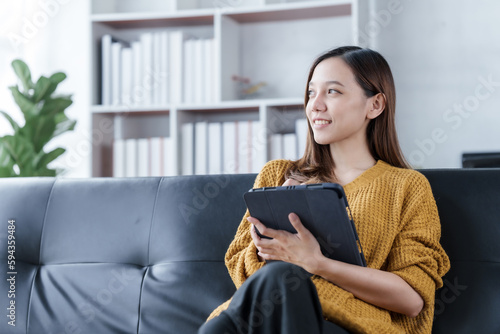 Using tablet pc, Pretty young asian woman housewife relax on comfortable sofa feels satisfied accomplish chores housework concept
